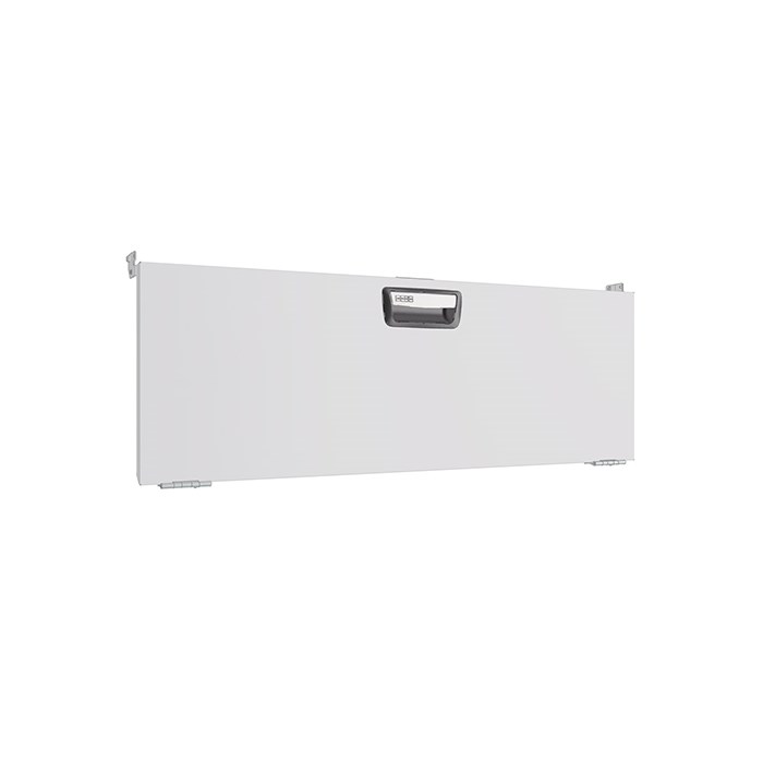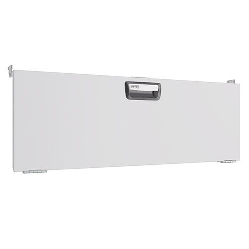 Drop down doors are fitted with gas springs on both sides that ensure smooth opening and closing. The opening angle is 90 degrees. The door pull has a built-in catch that prevents it from opening while the vehicle is in motion. The door is also suitable for wheel arch frames fitted with bench tops. When fitting doors between two shelf end supports, a mounting frame must be used.