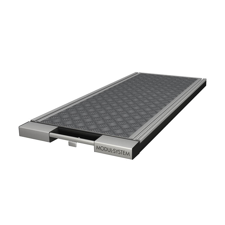 Lightweight and robust base frame made from ultra-high strength steel, with a front in anodized aluminum and a loading platform in lightweight sandwich material with an aluminum top.