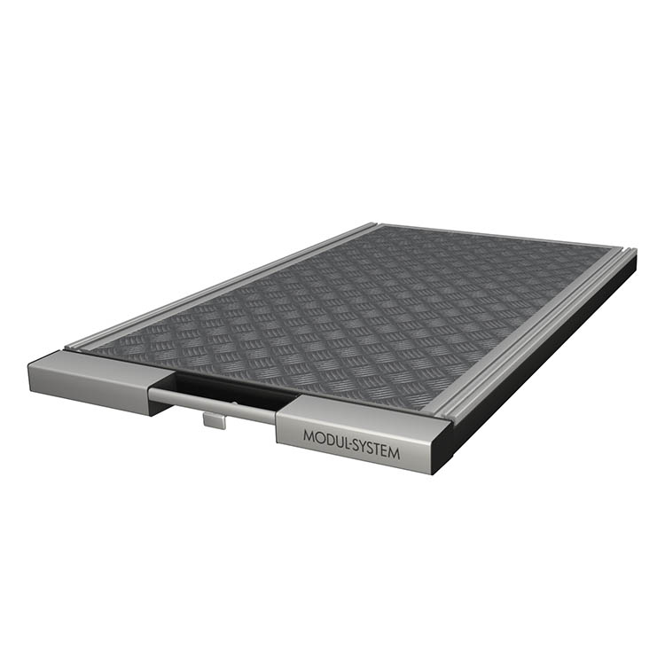 Lightweight and robust base frame made from ultra-high strength steel, with a front in anodized aluminum and a loading platform in lightweight sandwich material with an aluminum top.