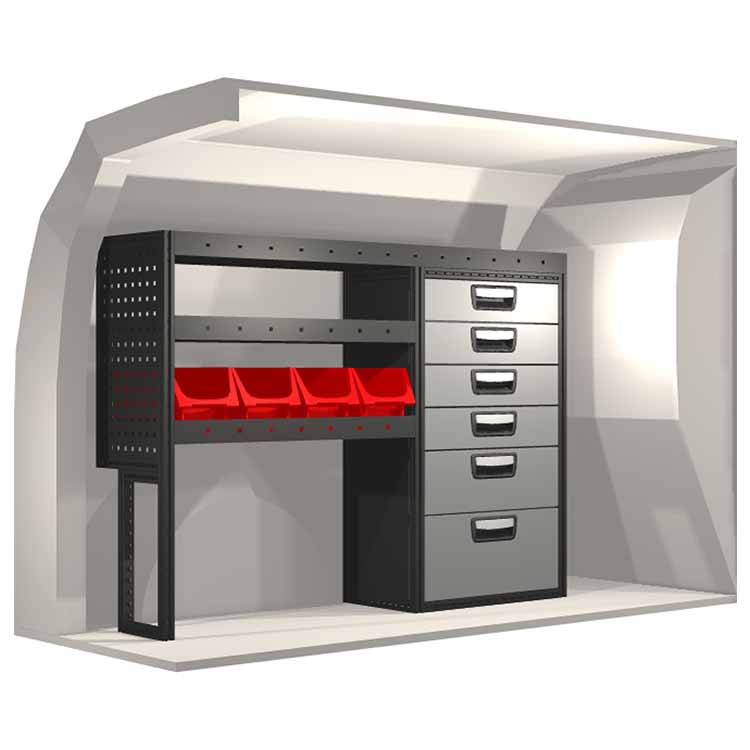 The racking has been specially designed to ensure the optimum fit to the vehicle, as well as the best possible functionality and safety. It has been developed for professional use, is flexible and is intended for service jobs in various types of business. All shelves are equipped with rubber mats, and all drawers with foam plastic liners. Assembly material is included.