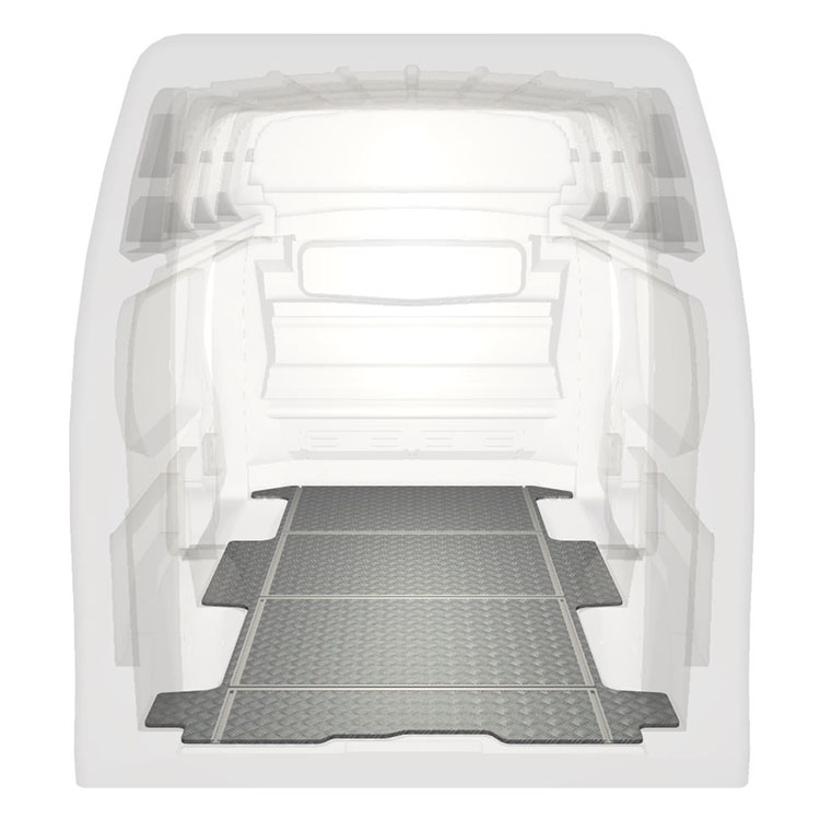 Lightweight and robust van floor with transverse rails for a Renault Trafic / Opel Vivaro / Fiat Talento / Nissan NV300 with anti-slip aluminum tread plate and cargo rails (longitudinal and transverse) for quick and safe installation of racking systems and other accessories.