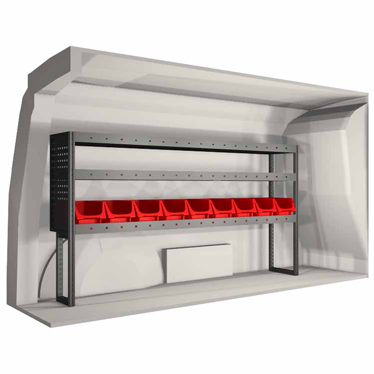 The racking has been specially designed to ensure the optimum fit to the vehicle, as well as the best possible functionality and safety. It has been developed for professional use, is flexible and is intended for service jobs in various types of business. All shelves are equipped with rubber mats, and all drawers with foam plastic liners. Assembly material is included.