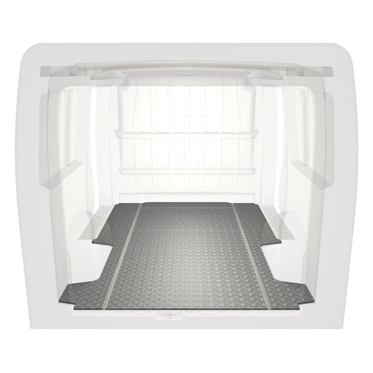 Lightweight and robust standard van floor for a Citroën Jumper / Peugeot Boxer / Fiat Ducato with anti-slip aluminum tread plate and cargo rails (longitudinal) for quick and safe installation of racking systems and other accessories.