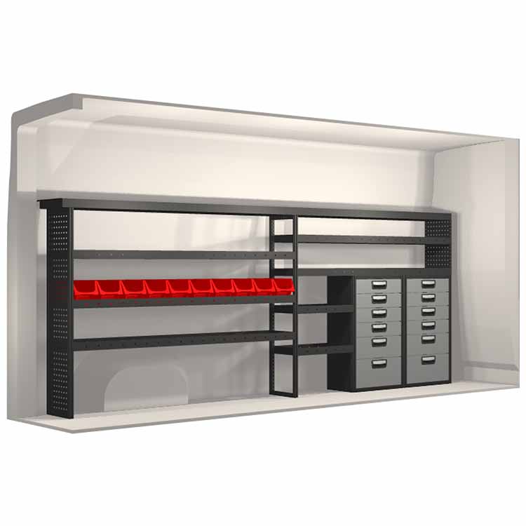 The racking has been specially designed to ensure the optimum fit to the vehicle, as well as the best possible functionality and safety. It has been developed for professional use, is flexible and is intended for service jobs in various types of business. All shelves are equipped with rubber mats, and all drawers with foam plastic liners. Assembly material is included.