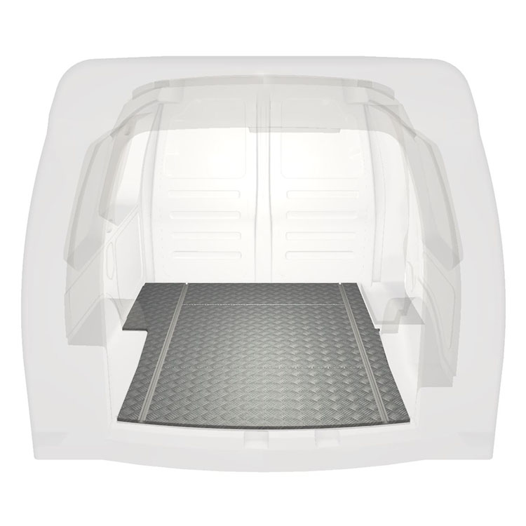 Lightweight and robust standard van floor for a Volkswagen Caddy with anti-slip aluminum tread plate and cargo rails (longitudinal) for quick and safe installation of racking systems and other accessories.