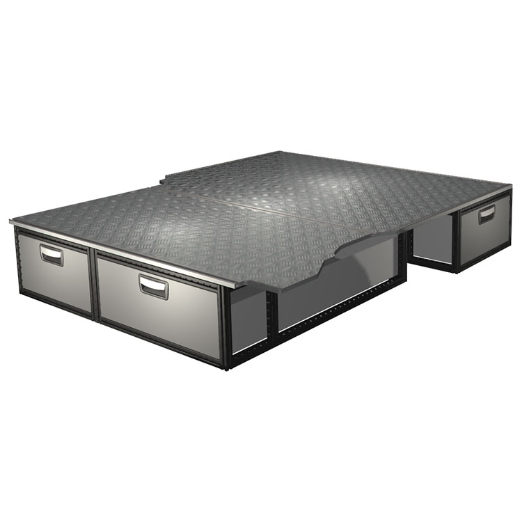 The kit is designed to be fitted on top of a Modul-Floor, utilizing the floor rails for a non-intrusive installation. The double floor is equipped with rails for easy installation of vehicle racking, and edging strips for a nice finish.