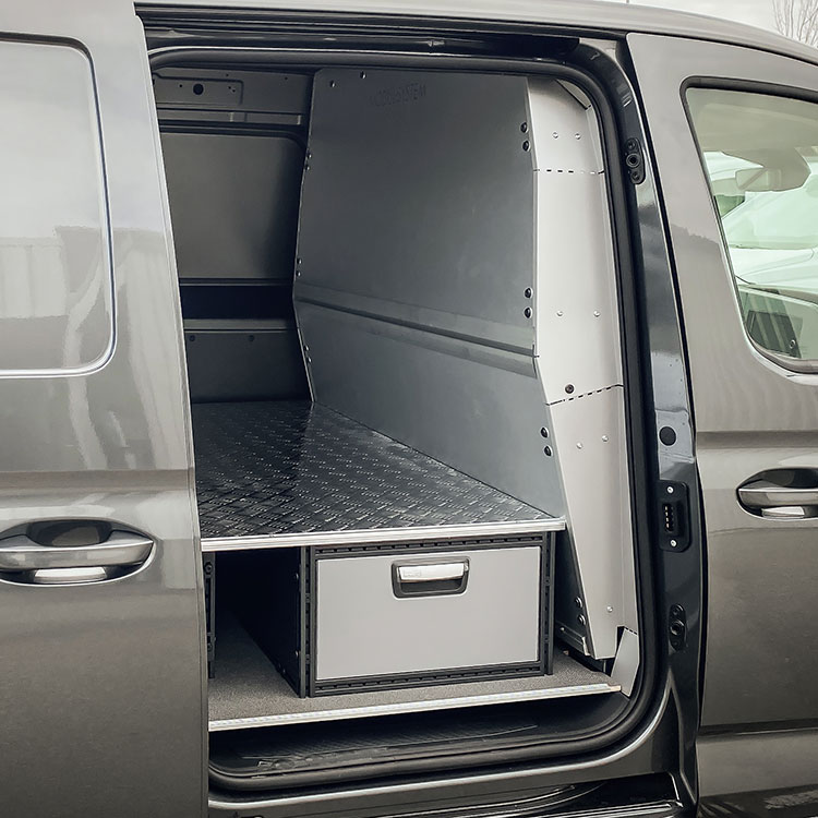 Lightweight, robust and collision safe bulkhead for Caddy Cargo and Caddy Cargo Maxi with a single side door on the right side.