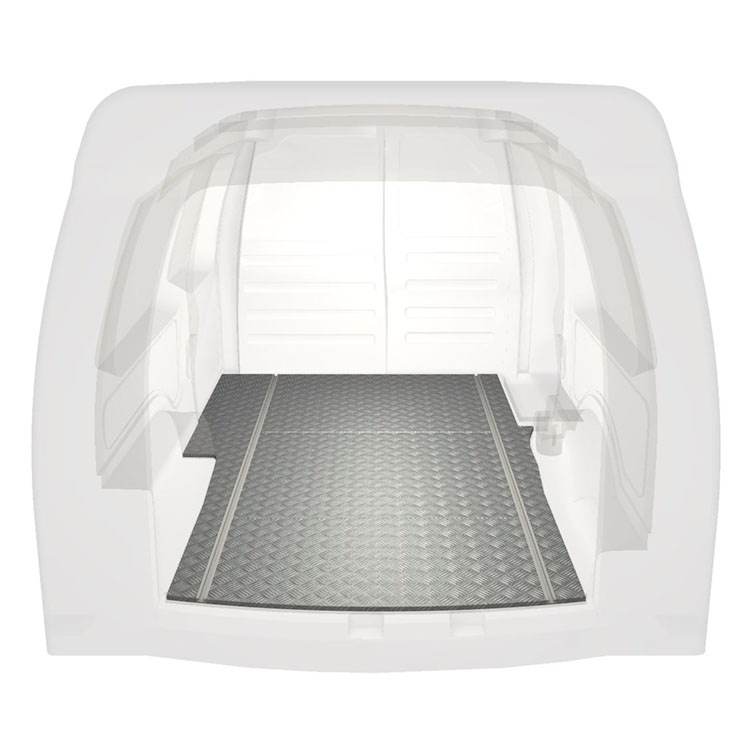 Lightweight and robust standard van floor for a Volkswagen Caddy Maxi with anti-slip aluminum tread plate and cargo rails (longitudinal) for quick and safe installation of racking systems and other accessories.