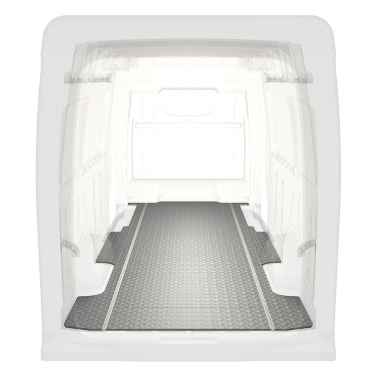 Lightweight and robust standard van floor for a Volkswagen Crafter / MAN TGE with anti-slip aluminum tread plate and cargo rails (longitudinal) for quick and safe installation of racking systems and other accessories.
