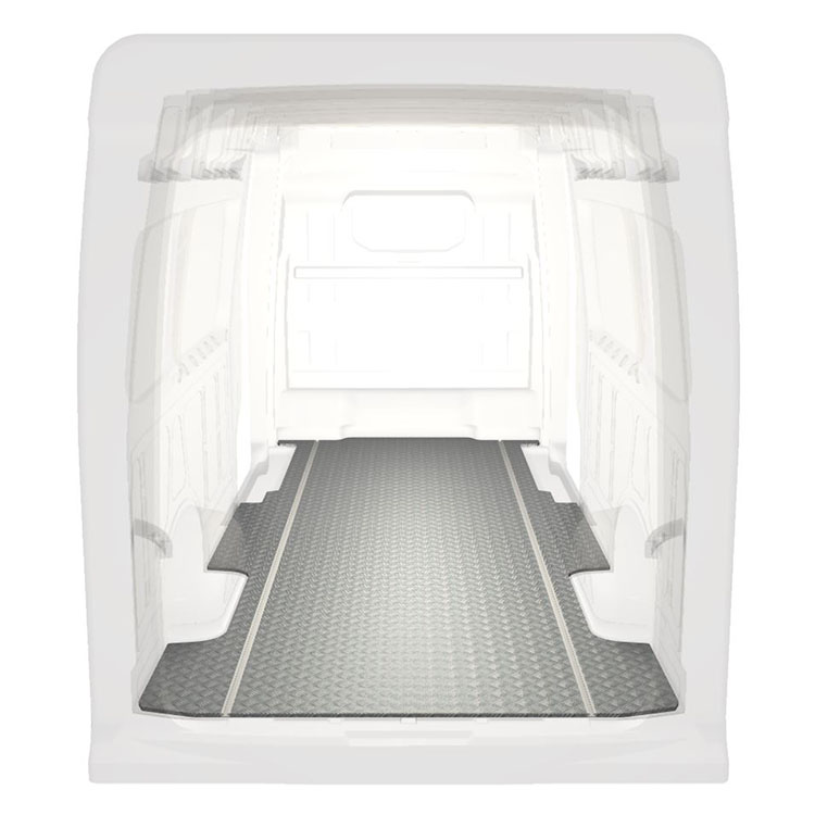 Lightweight and robust extra long floor for a Volkswagen Crafter / MAN TGE with anti-slip aluminum tread plate and cargo rails (longitudinal) for quick and safe installation of racking systems and other accessories.