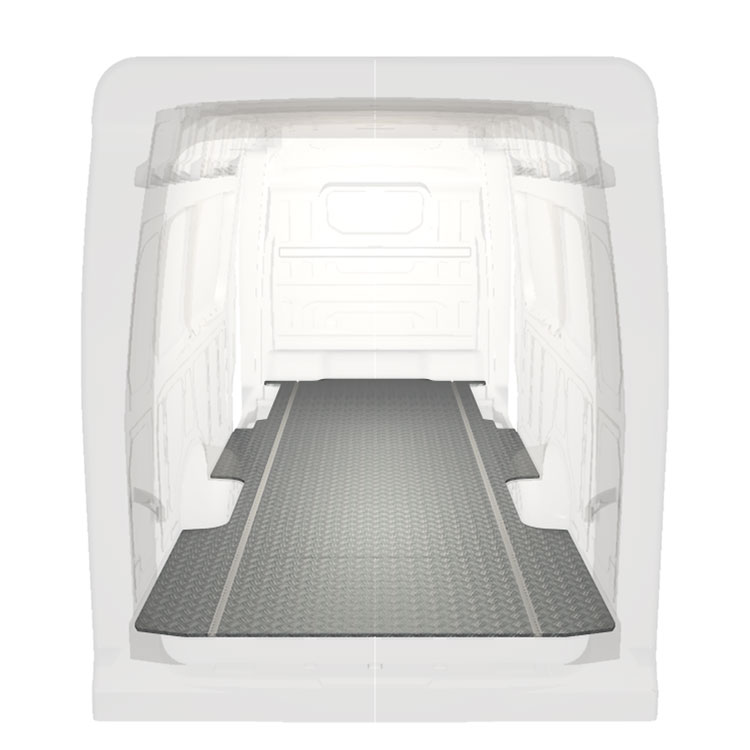 Lightweight and robust standard van floor for a Volkswagen Crafter / MAN TGE with anti-slip aluminum tread plate and cargo rails (longitudinal) for quick and safe installation of racking systems and other accessories.