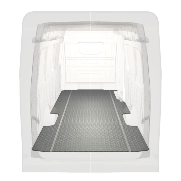 Lightweight and robust standard van floor for a Volkswagen Crafter / MAN TGE with anti-slip aluminum tread plate and cargo rails (longitudinal) for quick and safe installation of racking systems and other accessories.