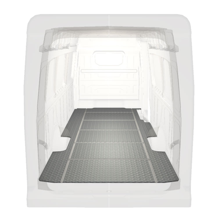 Lightweight and robust van floor with transverse rails for a Volkswagen Crafter / MAN TGE with anti-slip aluminum tread plate and cargo rails (longitudinal and transverse) for quick and safe installation of racking systems and other accessories.