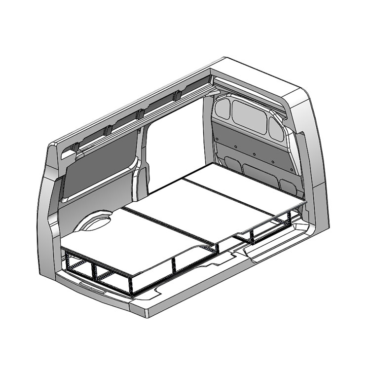 Double floor for a Volkswagen Transporter 2016- L2 with heater. The floor is designed to fit an extra-long drawer solution with one drawer unit 486x1458x270 and one 648x1458x270 coming out from the rear doors, and one drawer unit 648x1458x270 coming out from the side door.