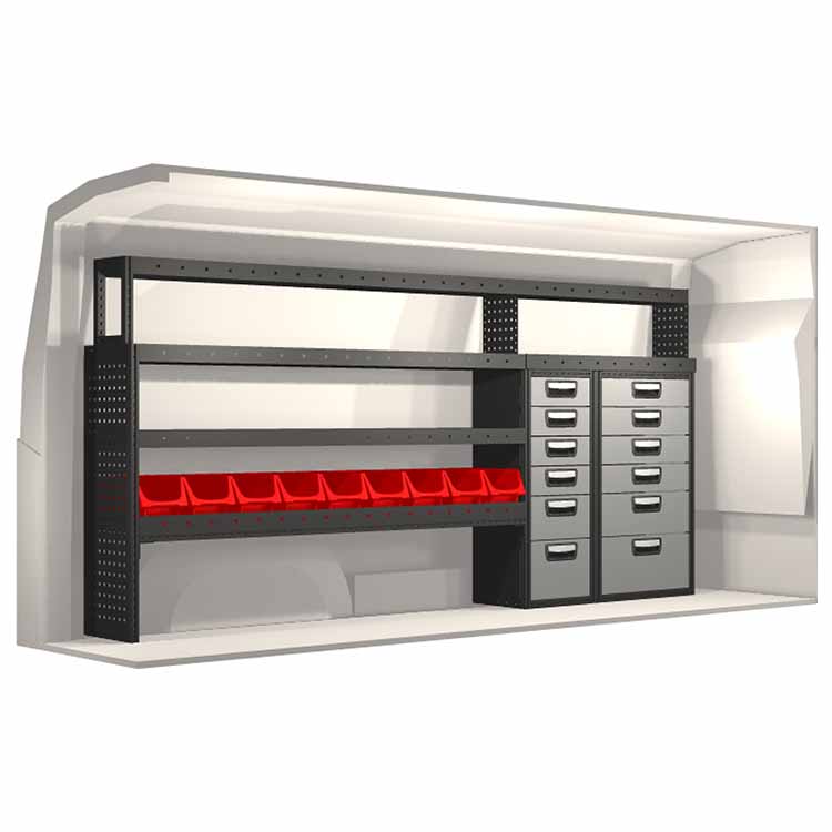 The racking has been specially designed to ensure the optimum fit to the vehicle, as well as the best possible functionality and safety. It has been developed for professional use, is flexible and is intended for service jobs in various types of business. All shelves are equipped with rubber mats, and all drawers with foam plastic liners. Assembly material is included.